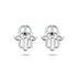 Zilveren oorbellen in de vorm van een Hamsa Handje, ook wel Fatima Handje of Gelukshandje genoemd, met in de handpalm een blauw emaille oogje.